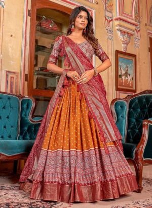 Tussar Silk With Leheriya Print And Foil Lehenga c...