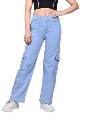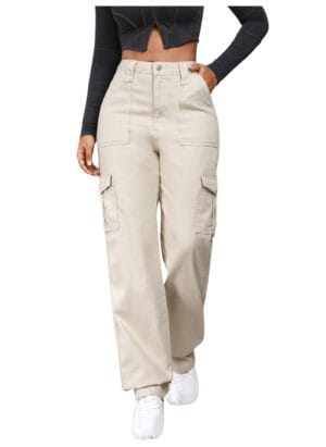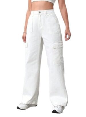 Women Cargo Flap Pocket Denim Cream Jeans Pant (6P...